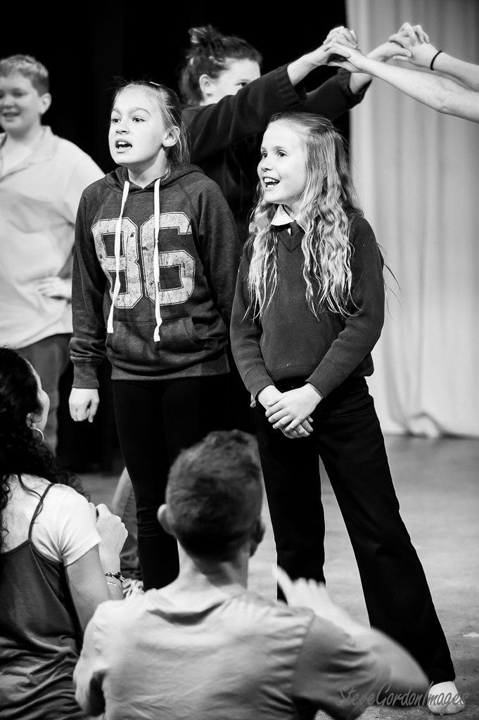 GalleriesArtsTheatre6 Sound of MusicRehearsalsChildren's Play, Black And White. Children's Play, Black And White. Two girls perform on stage, one in a '96' hoodie. Others hold hands above them. They are acting. Children's Play, Black And White.
