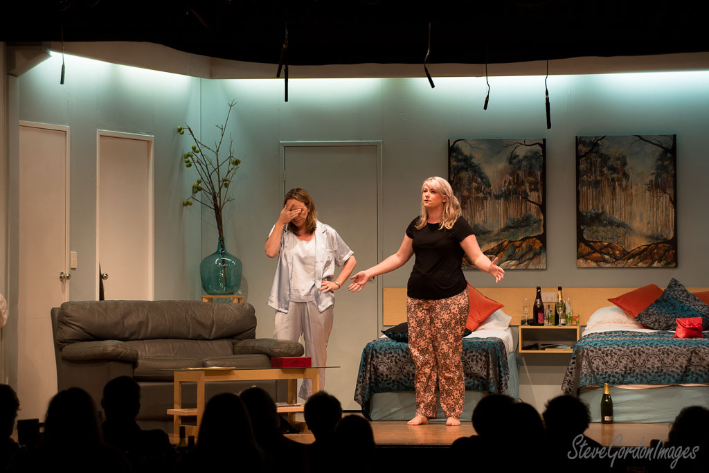 GalleriesArtsTheatre7 Secret Bridesmaids BusinessPerformancesStage Play, Two Actors, Bedroom. Stage Play, Two Actors, Bedroom. Two actresses perform a play. One in pajamas covers her face, the other gestures to the audience. A bed and couch are on stage. Stage Play, Two Actors, Bedroom.