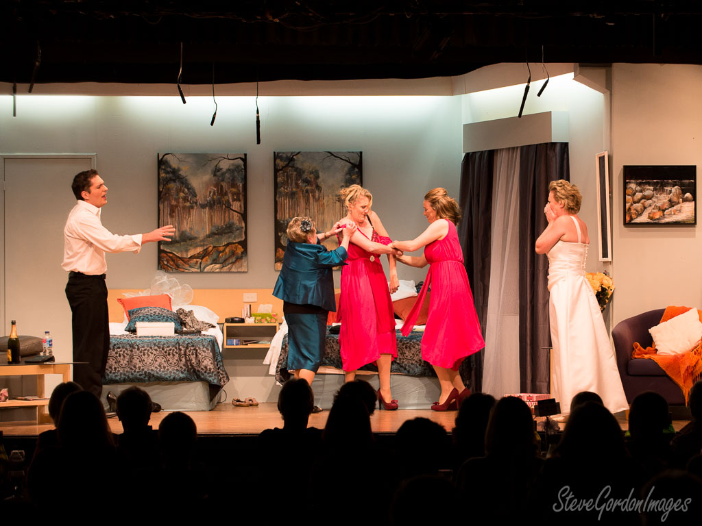 GalleriesArtsTheatre7 Secret Bridesmaids BusinessPerformancesStage Play, Actors, Costumes, Drama. Stage Play, Actors, Costumes, Drama. On stage, actors perform a play. A woman in a red dress is being helped by others. The audience watches. Stage Play, Actors, Costumes, Drama.