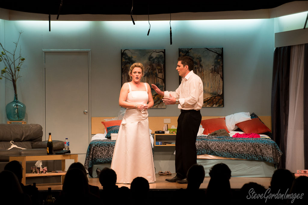 GalleriesArtsTheatre7 Secret Bridesmaids BusinessPerformancesStage Play, Actors, Bedroom, Drama, Scene. Stage Play, Actors, Bedroom, Drama, Scene. A woman in a wedding dress and a man in a white shirt act on a stage. A play. Stage Play, Actors, Bedroom, Drama, Scene.