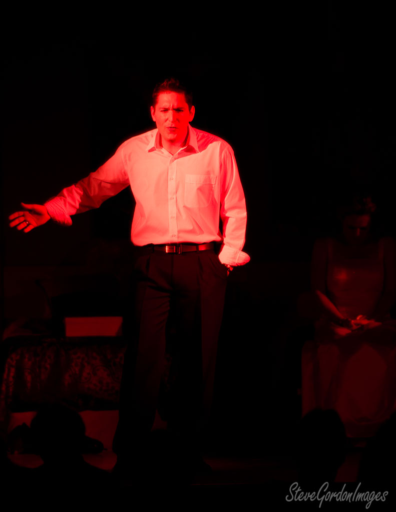 GalleriesArtsTheatre7 Secret Bridesmaids BusinessPerformancesRed Lit Stage Drama Scene Red Lit Stage Drama Scene A man in a white shirt gestures on stage, a woman sits nearby. They perform in a play. Red Lit Stage Drama Scene