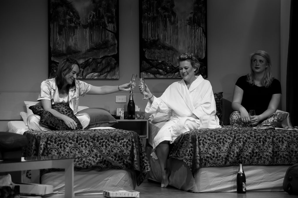 GalleriesArtsTheatre7 Secret Bridesmaids BusinessRehearsalsChampagne Toast, Pre-Wedding Celebration. Champagne Toast, Pre-Wedding Celebration. Three women celebrate with champagne. One wears a robe, another pajamas, and the third, a black shirt. A bottle sits nearby. Champagne Toast, Pre-Wedding Celebration.