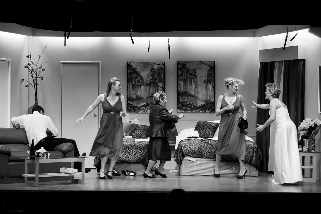 GalleriesArtsTheatre7 Secret Bridesmaids BusinessRehearsalsStage Play: Women, Drama, BlackAndWhite. Stage Play: Women, Drama, BlackAndWhite. On stage, women in dresses act out a scene. A man sits on a couch, a bottle on the table. Stage Play: Women, Drama, BlackAndWhite.