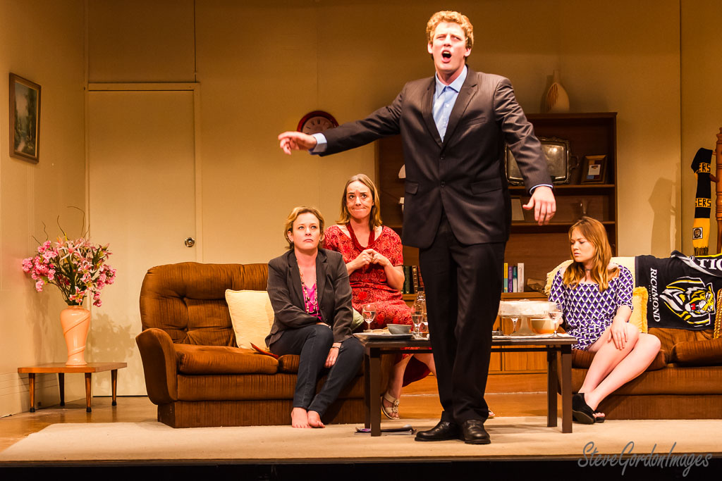 GalleriesArtsTheatre8 Its my partyPerformancesStage Play, Actors, Drama, Scene, Theatre. Stage Play, Actors, Drama, Scene, Theatre. A man in a suit gestures dramatically. Three women watch. A clock shows 10:00. A Richmond Tigers blanket is visible. Stage Play, Actors, Drama, Scene, Theatre.