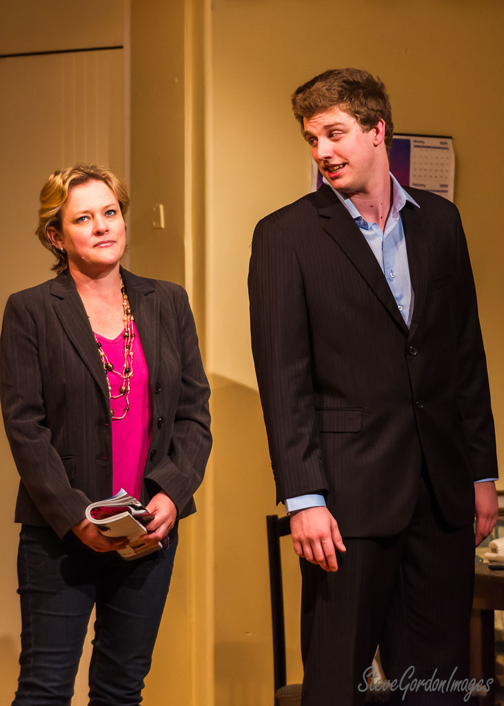 GalleriesArtsTheatre8 Its my partyPerformancesActors In Suits, Stage Scene. Actors In Suits, Stage Scene. A woman and man stand together. The man wears a suit, the woman holds a magazine. They are on stage. Actors In Suits, Stage Scene.