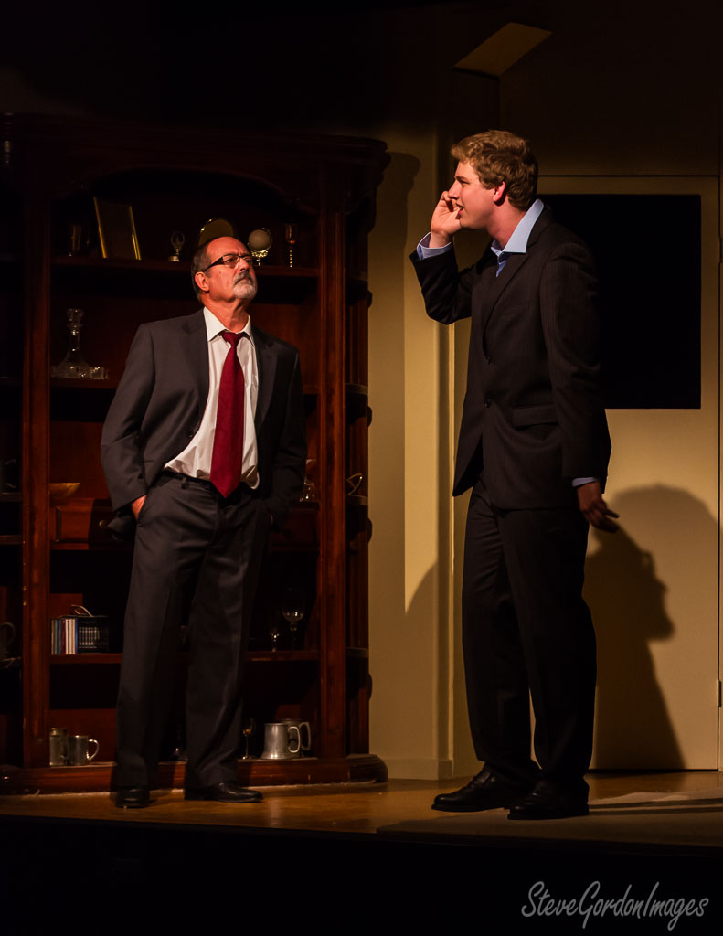 GalleriesArtsTheatre8 Its my partyPerformancesDramatic Scene, Two Men Talking. Dramatic Scene, Two Men Talking. Two men in suits, one listening, the other speaking, on a stage with a bookcase. A play. Dramatic Scene, Two Men Talking.