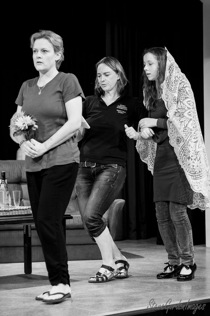 GalleriesArtsTheatre8 Its my partyRehearsalsThree Women On Stage. Three Women On Stage. Three women perform a play. One holds flowers, another a script, and the third wears a veil. "Secret Bridesmaids Business 2013" is on a shirt. Three Women On Stage.
