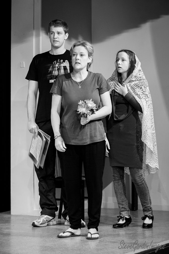GalleriesArtsTheatre8 Its my partyRehearsalsStage Play Cast, Black And White. Stage Play Cast, Black And White. Three actors stand on stage. The woman holds flowers, the girl wears a shawl, and the man holds papers. Stage Play Cast, Black And White.