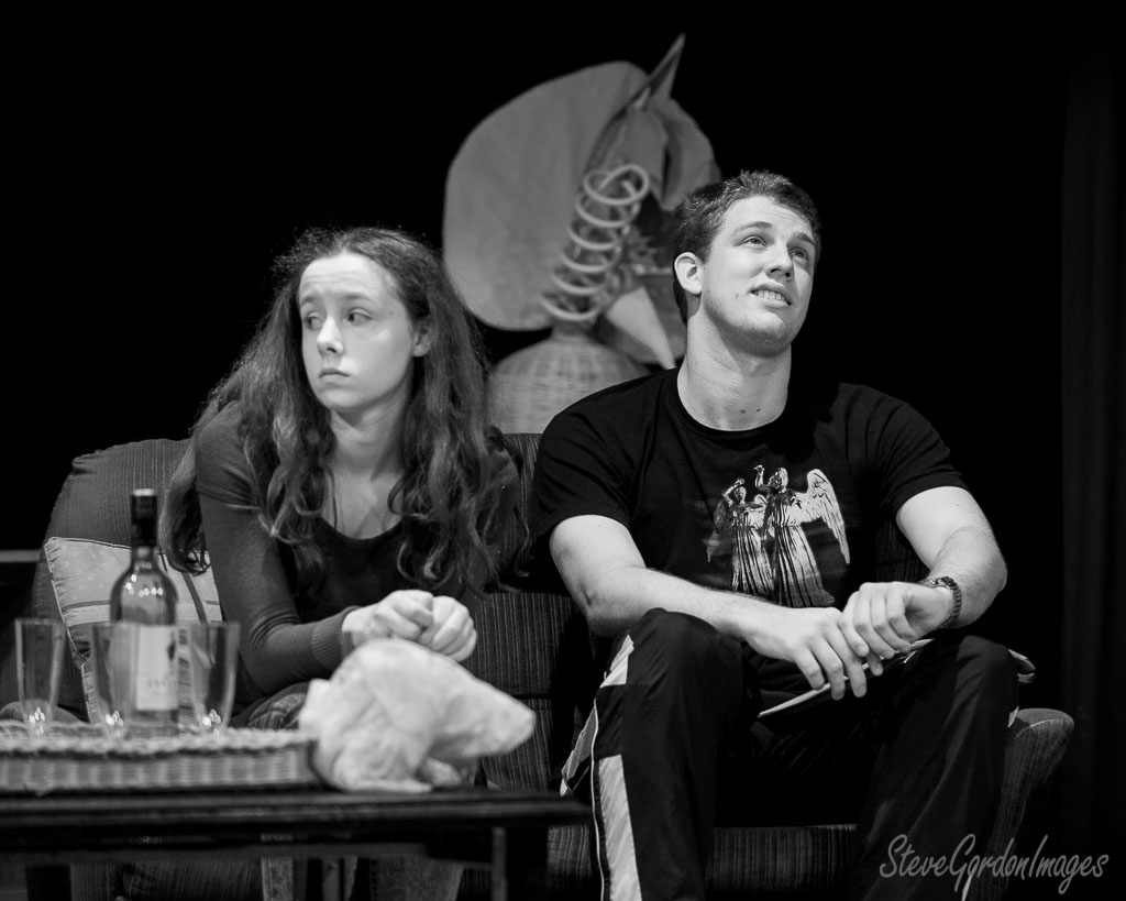 GalleriesArtsTheatre8 Its my partyRehearsalsActors, Stage, Black And White. Actors, Stage, Black And White. Two actors, a man in a black shirt and a woman, sit on a stage. A bottle and glasses sit on a table. Actors, Stage, Black And White.