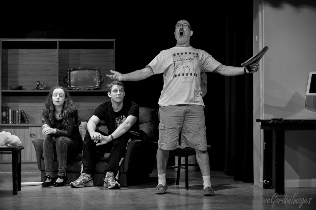 GalleriesArtsTheatre8 Its my partyRehearsalsActors Rehearsing, Stage Play. Actors Rehearsing, Stage Play. On stage, a man in a "MOTAR" shirt acts, while two others watch, one with eyes closed. Actors Rehearsing, Stage Play.