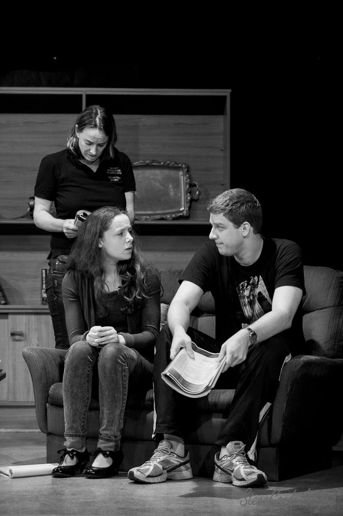GalleriesArtsTheatre8 Its my partyRehearsalsActors Rehearsing, Black And White. Actors Rehearsing, Black And White. Actors rehearse a scene. The woman in the black shirt holds a script. The man wears a Nike shirt. "Secret Broadsides Business 2013" is on the shirt. Actors Rehearsing, Black And White.