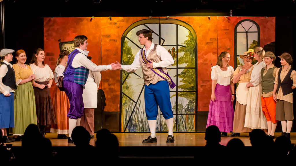 GalleriesArtsTheatre9 CinderellaPerformanceStage Play: Handshake, Costumes, Audience. Stage Play: Handshake, Costumes, Audience. Two men shake hands on stage, surrounded by actors in costume. The play's backdrop shows "VILLAGE NEWS". Stage Play: Handshake, Costumes, Audience.