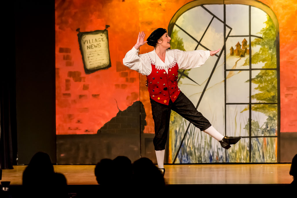 GalleriesArtsTheatre9 CinderellaPerformanceActor In Costume, Stage Performance. Actor In Costume, Stage Performance. A performer, in costume, acts on stage. The "Village News" is visible on the backdrop. The audience watches. Actor In Costume, Stage Performance.