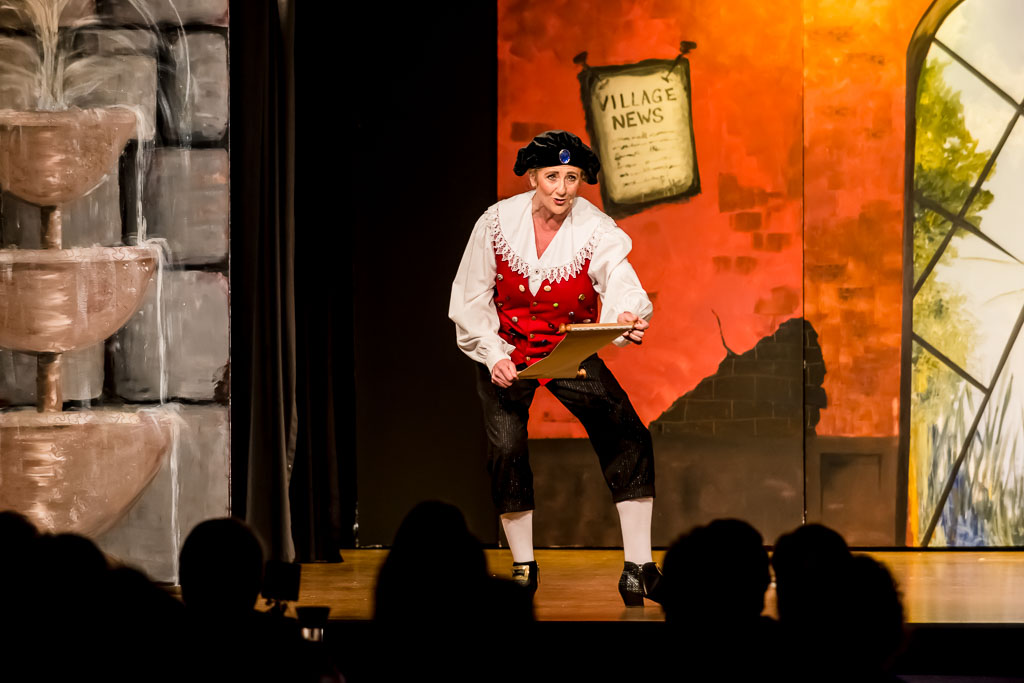 GalleriesArtsTheatre9 CinderellaPerformanceStage Actor, Red Vest, Scroll. Stage Actor, Red Vest, Scroll. A performer, dressed in costume, reads "VILLAGE NEWS" on stage. The audience watches the play. Stage Actor, Red Vest, Scroll.