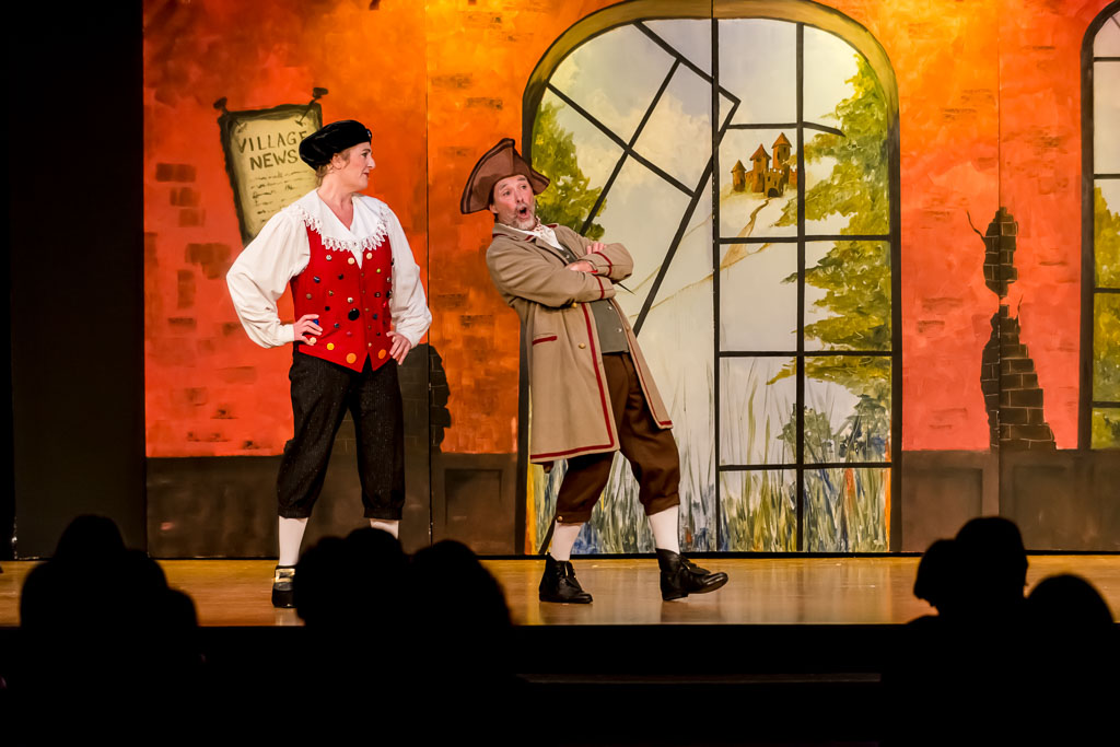 GalleriesArtsTheatre9 CinderellaPerformanceStage Play, Actors, Costumes, Painted Backdrop. Stage Play, Actors, Costumes, Painted Backdrop. Two actors perform on stage. The man reacts with surprise, the woman looks on. A "Village News" sign is visible. Stage Play, Actors, Costumes, Painted Backdrop.