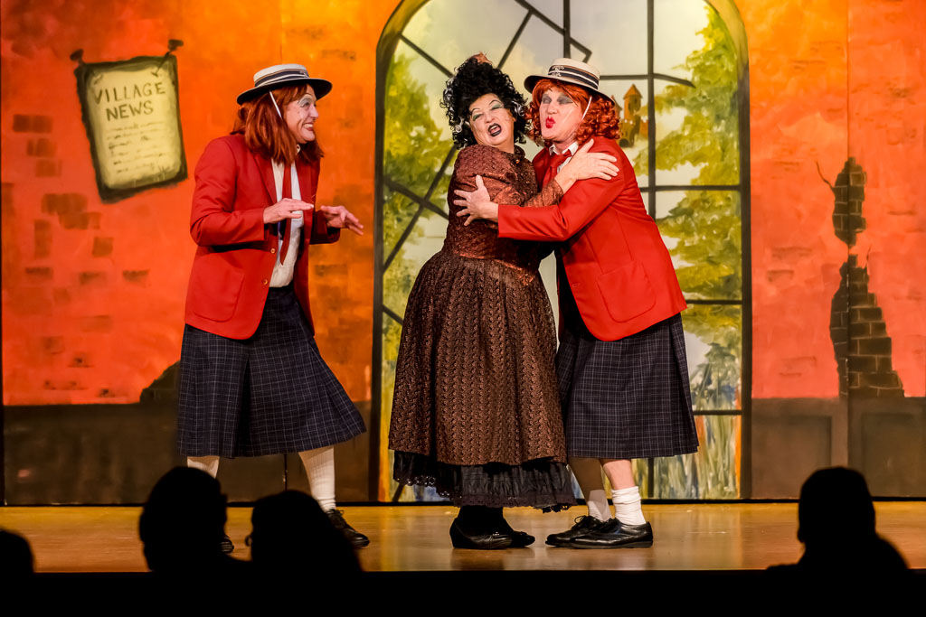 GalleriesArtsTheatre9 CinderellaPerformanceStage Play, Red Jackets, Skirts. Stage Play, Red Jackets, Skirts. Three actors in costume perform on stage. "Village News" sign hangs on the wall. They appear to be in a play. Stage Play, Red Jackets, Skirts.