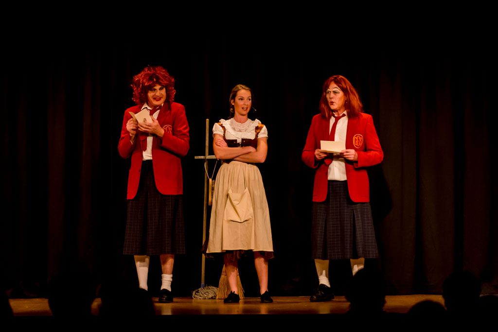 GalleriesArtsTheatre9 CinderellaPerformanceStage Play, Red Jackets, Skirts. Stage Play, Red Jackets, Skirts. On stage, two actors in red blazers and skirts read from papers. A woman in a dress stands between them. GGS. Stage Play, Red Jackets, Skirts.