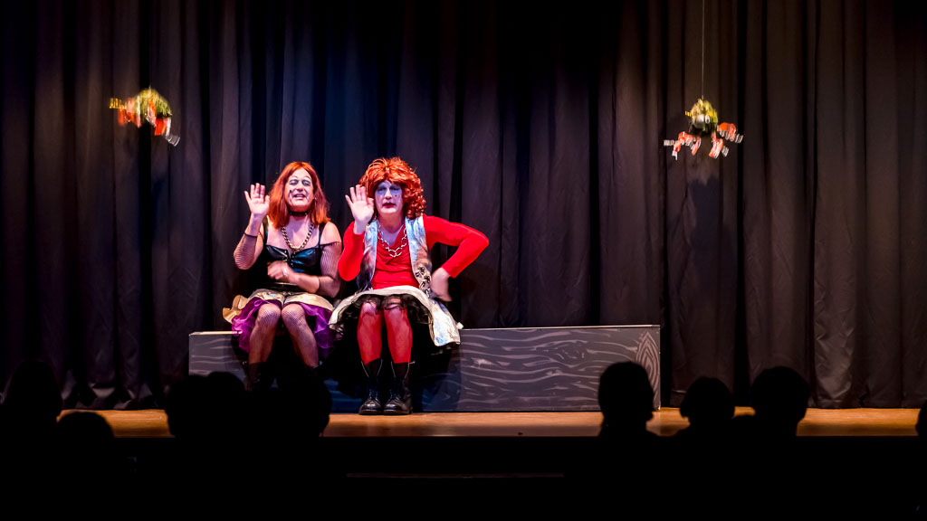 GalleriesArtsTheatre9 CinderellaPerformanceStage Performers, Waving, Audience, Curtains Stage Performers, Waving, Audience, Curtains Two performers, in costume, wave to the audience during a stage performance. The stage has hanging decorations. Stage Performers, Waving, Audience, Curtains