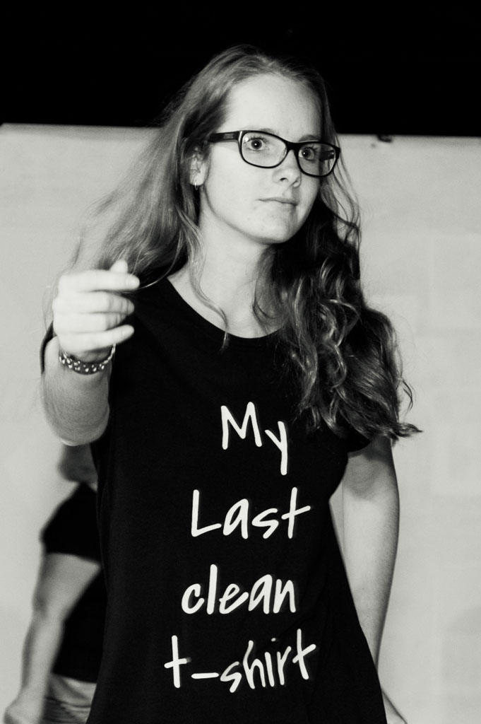 GalleriesArtsTheatre9 CinderellaRehearsalsGirl, T-shirt, Glasses, Black And White. Girl, T-shirt, Glasses, Black And White. A young woman, wearing glasses and a "My Last clean t-shirt" points, at someone. Girl, T-shirt, Glasses, Black And White.