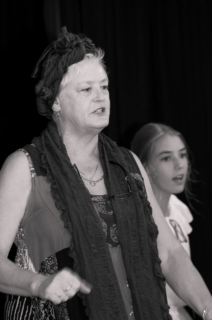 GalleriesArtsTheatre9 CinderellaRehearsalsWoman In Costume, Speaking. Woman In Costume, Speaking. An older woman, wearing a headscarf and scarf, speaks on stage. A younger woman stands behind her. They perform. Woman In Costume, Speaking.