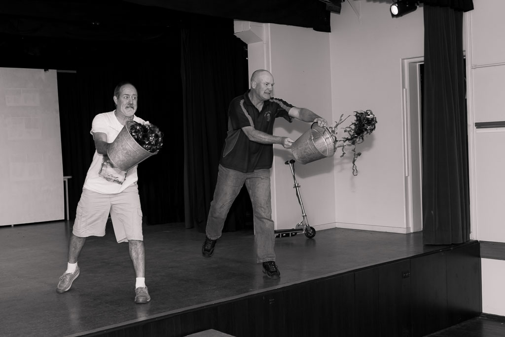GalleriesArtsTheatre9 CinderellaRehearsalsStage Antics With Bucket And Plants. Stage Antics With Bucket And Plants. Two men on stage, one with a bucket of foliage, the other emptying a bucket of streamers. A scooter sits nearby. Stage Antics With Bucket And Plants.