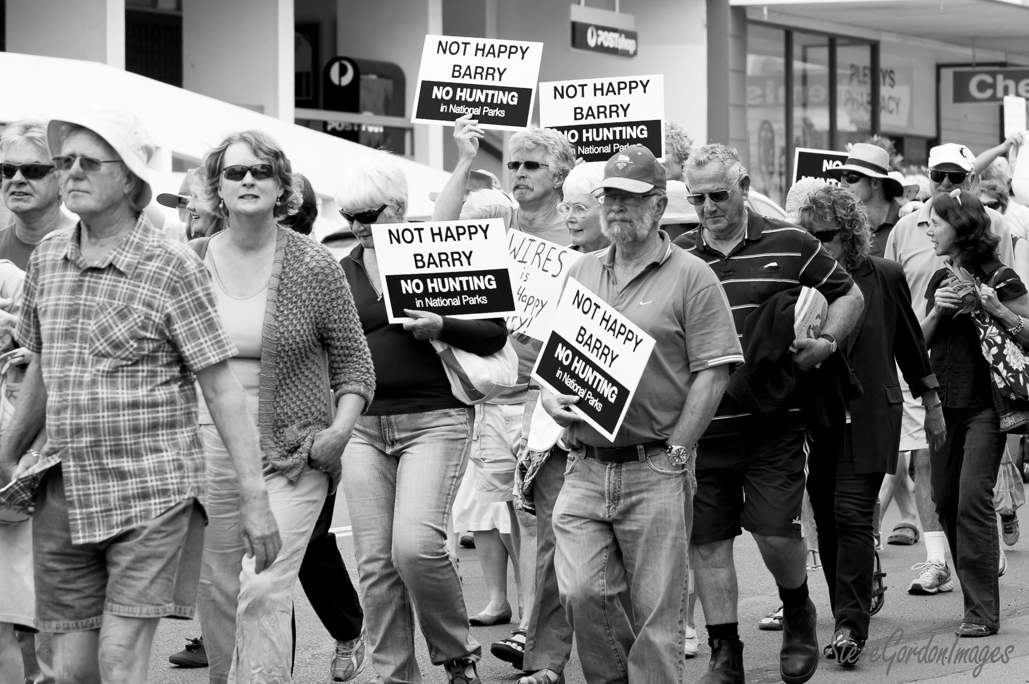 GalleriesHumanitiesProtestsBarry's Unhappy Hunting Protest Barry's Unhappy Hunting Protest Citizens march, holding signs that read "Not Happy Barry, No Hunting in National Parks," protesting a hunting policy. Barry's Unhappy Hunting Protest
