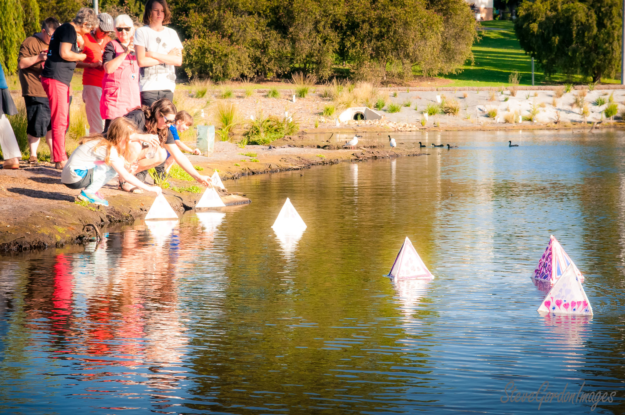GalleriesHumanitiesProtestsPyramid flotilla launch party Pyramid flotilla launch party A group launches handmade paper boats into a pond, watched by family, for fun. Pyramid flotilla launch party