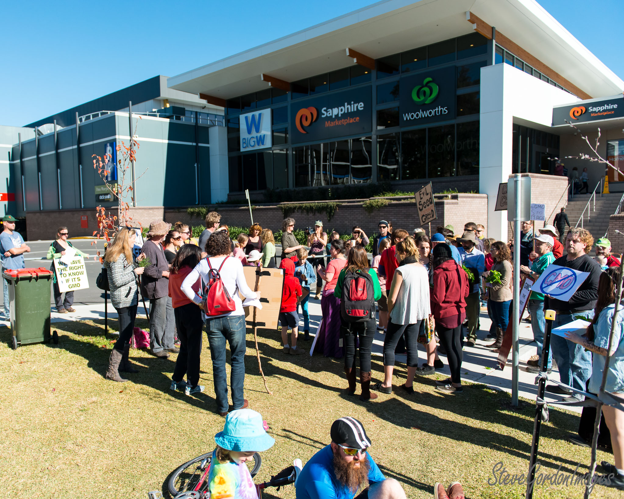 GalleriesHumanitiesProtestsGMO Protest Picnic GMO Protest Picnic People protest GMOs outside Sapphire Marketplace, urging Woolworths and Big W to label GMO products. GMO Protest Picnic
