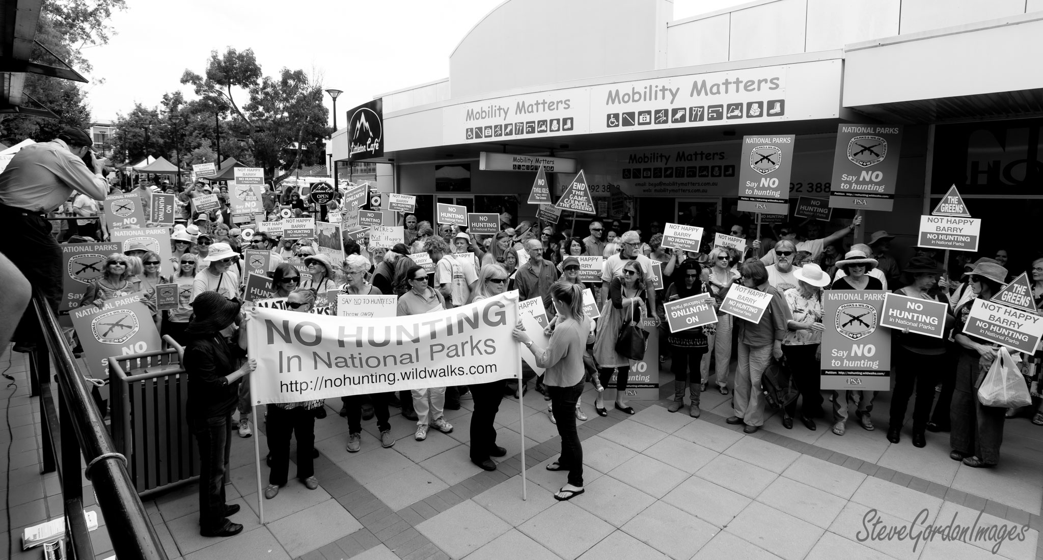 GalleriesHumanitiesProtestsBarry Hunting Protest Mob Barry Hunting Protest Mob Activists protest hunting in national parks, holding signs and a banner with a website link. Barry Hunting Protest Mob