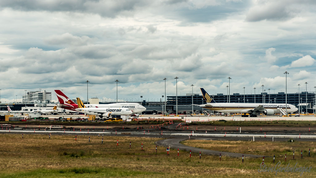 GalleriesTransportationAirAirport Planes Under Cloudy Sky. Airport Planes Under Cloudy Sky. Qantas, Tigerair, and Singapore Airlines planes sit at the airport. The planes are ready for flight. Airport Planes Under Cloudy Sky.