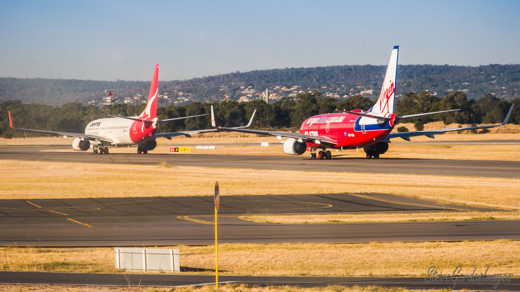 GalleriesTransportationAirQantas And Virgin Aircraft Taxiing Together. Qantas And Virgin Aircraft Taxiing Together. Qantas and Virgin Australia aircraft taxi on the runway. Both planes prepare for takeoff. 21B is visible. Qantas And Virgin Aircraft Taxiing Together.