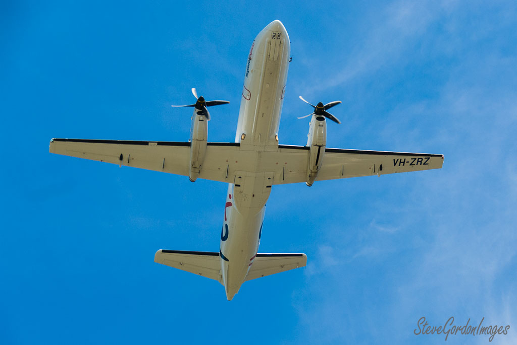 GalleriesTransportationAirUnderside Plane, Blue Sky, Propellers. Underside Plane, Blue Sky, Propellers. A Regional Express aircraft, VH-ZRZ, flies overhead. The plane's propellers spin against a blue sky. Underside Plane, Blue Sky, Propellers.
