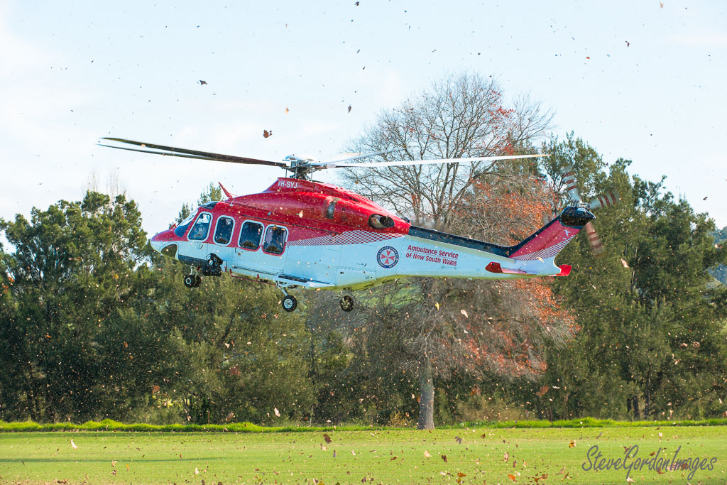 GalleriesTransportationAirHelicopter, Leaves, Green, Sky, Australia. Helicopter, Leaves, Green, Sky, Australia. A red and white Ambulance Service of New South Wales helicopter, VH-SYJ, takes off from a grassy field. Helicopter, Leaves, Green, Sky, Australia.