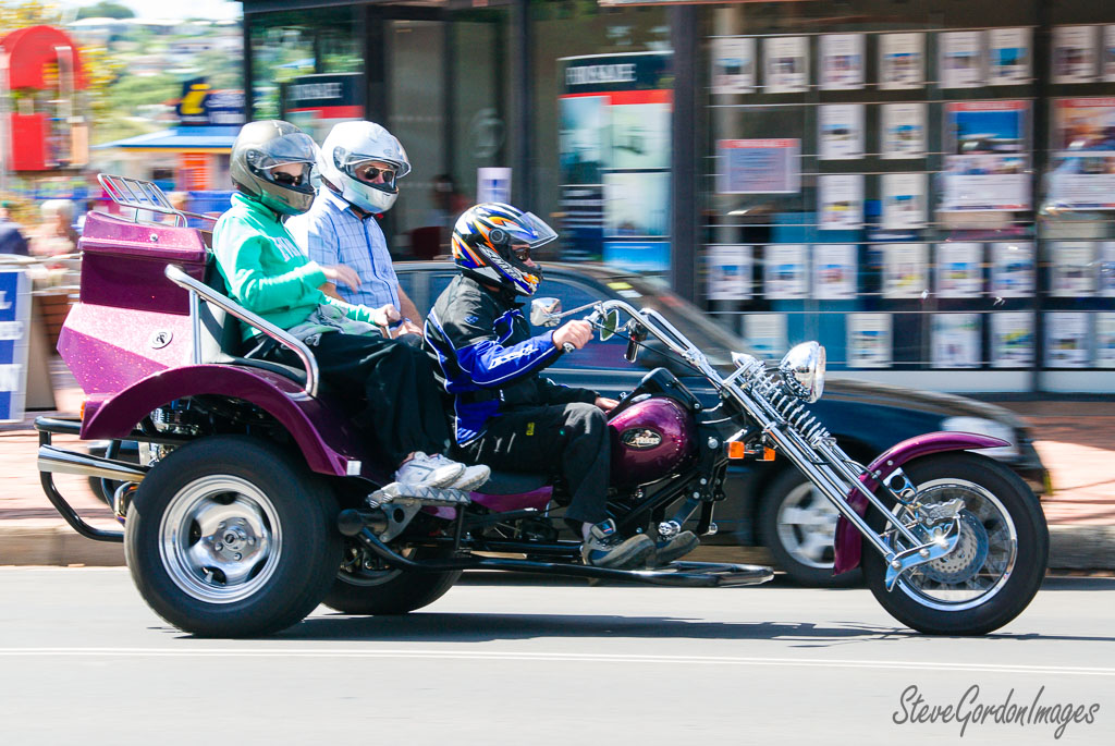 GalleriesTransportationMotorcyclesPurple Trike, Three People, Street. Purple Trike, Three People, Street. Three people ride a purple trike motorcycle down a street. The driver wears a helmet. They are enjoying a ride. Purple Trike, Three People, Street.