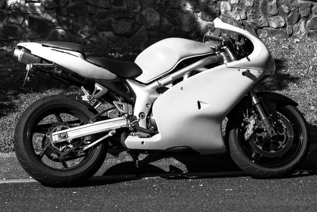 GalleriesTransportationMotorcyclesMonochrome Motorcycle, Stone Wall, Shadow. Monochrome Motorcycle, Stone Wall, Shadow. A white motorcycle, parked on asphalt, rests against a stone wall, ready for a ride. Monochrome Motorcycle, Stone Wall, Shadow.
