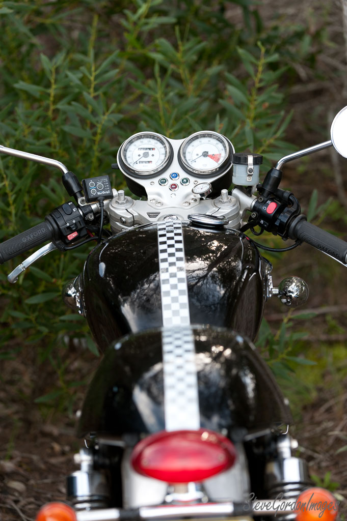 GalleriesTransportationMotorcyclesMotorcycle's Glossy Tank, Checkered Stripe. Motorcycle's Glossy Tank, Checkered Stripe. A Triumph motorcycle, with 25083 km/h on the speedometer, sits ready for a ride. Motorcycle's Glossy Tank, Checkered Stripe.