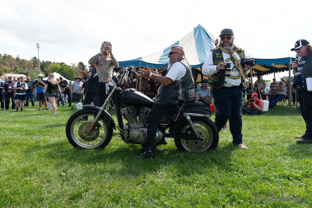 GalleriesTransportationMotorcyclesMotorcycle Show, Tattooed Man, Applause. Motorcycle Show, Tattooed Man, Applause. A biker sits on a motorcycle, surrounded by people, possibly at a motorcycle club event. Motorcycle Show, Tattooed Man, Applause.